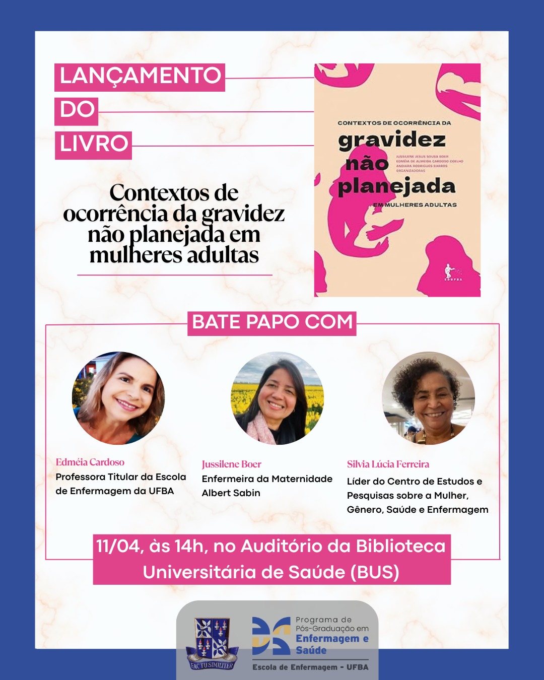 A Escola de Enfermagem da UFBA, juntamente com o Programa de Pós-Graduação (PPGENF), convida todas as pessoas a participar do lançamento do livro “Contextos de ocorrência da gravidez não planejada em mulheres adultas”.